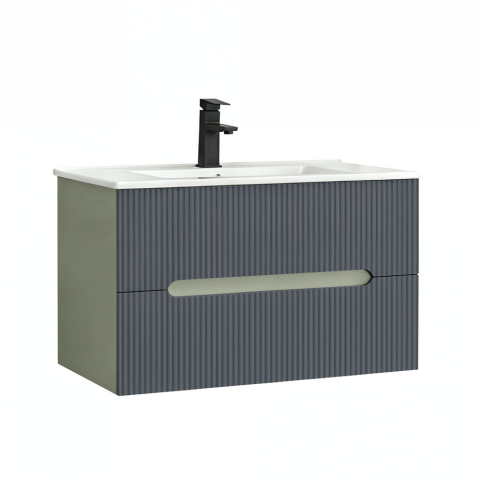 Leziter Trent Fürdőszobabútor 80 cm kerámia mosdóval (2 fiókos) Zöld - Antracit szürkeBútor:Szélesség: 80 cmMélység: 45 cmMagasság: 48 cmKivitel: fali függesztésFront: 18 mm MDF, PVC fóliávalKorpus: 15 mm MDF, melamin borítássalNyitás: rejtett, integrált fogantyúFiókok: 2 db, teljesen kihúzható, soft-close rendszerrelFelső fiók: U-alakú kivágás a szifon számáraSzín: Zöld-Antracit szürkeLapra szerelve szállítjukMosdó:Anyaga: fényes fehér kerámiaKönnyen