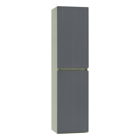 Trent függesztett oldal szekrény Olivazöld-Antracit szürkeSzélesség: 35 cmMélység: 30 cmMagasság: 140 cmFront: bordázottKorpus: ellenálló, nedvességtűrő laminált lapKivitel: fali függesztésNyitás: rejtett, integrált fogantyúBelső elrendezés: 4 polcosF