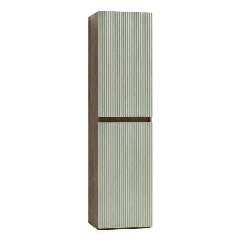 Trent függesztett oldal szekrény Sunset tölgy-OlivazöldSzélesség: 35 cmMélység: 30 cmMagasság: 140 cmFront: bordázottKorpus: ellenálló, nedvességtűrő laminált lapKivitel: fali függesztésNyitás: rejtett, integrált fogantyúBelső elrendezés: 4 polcosFoga