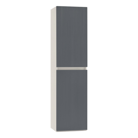Trent függesztett oldal szekrény Fehér-Antracit szürkeSzélesség: 35 cmMélység: 30 cmMagasság: 140 cmFront: bordázottKorpus: ellenálló, nedvességtűrő laminált lapKivitel: fali függesztésNyitás: rejtett, integrált fogantyúBelső elrendezés: 4 polcosFogan