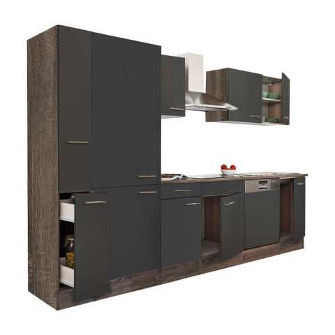 Yorki 310 Konyhabútor: Elegáns, modern konyha 300 cm-es szélességgel ✨ Ez a stílusos Yorki 310 konyhabútor tökéletes választás modern és elegáns konyha kialakításához. A selyemfényű antracit front és a yorki tölgy színű korpusz lenyűgöző kombinációj...