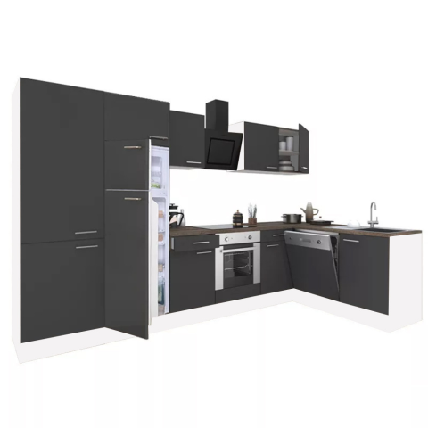 Yorki 340 sarok konyhabútor alsó sütős felülfagyasztós hűtős kivitelben Yorki 340 sarok konyhablokk fehér korpusz, selyemfényű antracit fronttal. A tökéletes konyha megteremtője! Minőségi hazai gyártású moduláris konyhabútor, mely kielégíti bármely ked