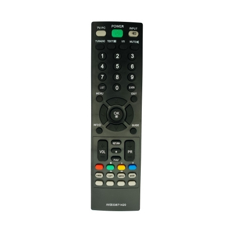 LG AKB33871420 távirányító LCD TV-hez, utángyártott. Ez azt jelenti, hogy gombkiosztásban megegyezik a gyári távirányítóval, de nincs rajta márkajelzés. Az utángyártott távirányítóknál nincs szükség beállításra, a távirányító megérkezésekor az elemek behelyezése után egyből tudja használni az adott eszközzel(TV, DVD, stb..). A mennyiben nem találja a készülék típusszámát, küldje el részünkre és utánanézünk melyik távirányító jó hozzá