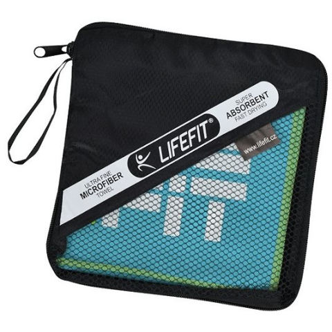 Törölköző - gyorsan száradó, sport, anyaga mikroszál, poliészter és poliamid, akasztófüllel, szállító táskával és gyorsan száradó, feliratos motívum, méretek 35 × 70 cm, kék színben A minőségi LIFEFIT® törölköző mérete 35 × 70 cm. Az akasztófülnek köszönhetően gyorsabb száradás jellemző rá használat után. A praktikus szállító táska kényelmes hordozhatóságot és higiénikus tárolást