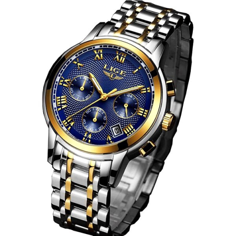 Karóra férfiaknak - analóg idő megjelenítés, óramű típusa quartz, kerek számlap, dátum, fényvisszaverő elemek és stopper, elegáns, arab és római indexek, ásványi számlap, 30 m (3 ATM) vízhatlanság, a tok anyaga rozsdamentes acél, a tok színe ezüst és arany, a szíj anyaga rozsdamentes acél, a szíj színe ezüst A klassz Lige 9849 férfiaknak karóra nagyszerű viselet hétköznap és ünnepnap is. Az alapját egy 42 mm-es kerek számlap alkotja. A Quartz óraszerkezet