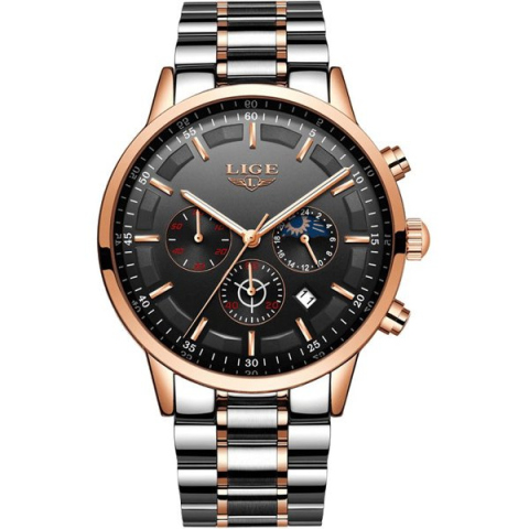 Karóra férfiaknak - analóg idő megjelenítés, óramű típusa quartz, kerek számlap, elegáns, arab indexek, ásványi számlap, a tok anyaga acél, a tok színe rózsaarany, a szíj anyaga acél, a szíj színe ezüst, cserélhető szíjjal A klassz Lige 9877C + ajándék férfiaknak karóra alkalmas mindennapi viseletre. Az évek óta bevált Quartz technológia precíz mérést és hosszú élettartamot biztosít. A kitűnő acél óraszíj első ránézésre