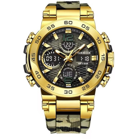 Karóra férfiaknak - analóg idő megjelenítés, óramű típusa quartz, kerek számlap, elegáns, arab indexek, ásványi számlap, a tok anyaga acél, a tok színe arany, a szíj anyaga acél, a szíj színe khaki, cserélhető szíjjal A klassz Lige FB0077 + ajándék férfiaknak karóra alkalmas mindennapi viseletre. A Quartz óraszerkezet pontos időmérést és hosszú élettartamot garantál. A minőségi acél szíj első ránézésre elkápráztat