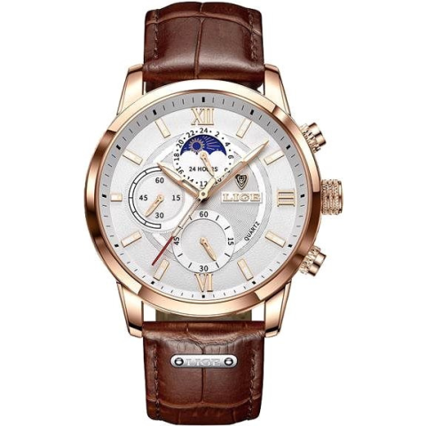 Karóra férfiaknak - analóg idő megjelenítés, óramű típusa quartz, kerek számlap, elegáns, arab és római indexek, ásványi számlap, 30 m (3 ATM) vízhatlanság, a tok anyaga rozsdamentes acél, a tok színe arany, a szíj anyaga bőr, a szíj színe barna A nagyszerű LIGE MAN 8932-2 férfiaknak karóra jó szolgálatot tesz a mindennapokban. Az alapját egy 43 mm széles kerek számlap alkotja. A Quartz óraszerkezet hosszú élettartamot és precíz időmérést biz