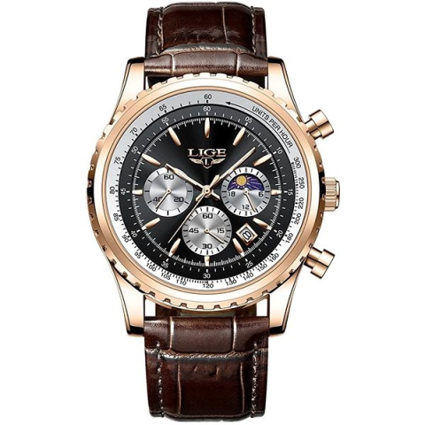 Karóra férfiaknak - analóg idő megjelenítés, óramű típusa quartz, kerek számlap, elegáns, arab indexek, ásványi számlap, 30 m (3 ATM) vízhatlanság, a tok anyaga rozsdamentes acél, a tok színe fekete, a szíj anyaga bőr, a szíj színe barna, cserélhető szíjjal A kitűnő Lige Man 8989-12 - rose gold black férfiaknak karóra remek választás a mindennapkora. A Quartz technológia precíz mérést és hosszú élettartamot biztosít. A kitűnő bőr szíj első ránézésre