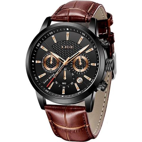Karóra férfiaknak - analóg idő megjelenítés, óramű típusa quartz, kerek számlap, dátum, fényvisszaverő elemek és stopper, elegáns, arab indexek, 30 m (3 ATM) vízhatlanság, a tok anyaga rozsdamentes acél, a tok színe fekete, a szíj anyaga bőr, a szíj színe barna A kitűnő LIGE MAN 9866-3 férfiaknak karóra nagyszerű viselet hétköznap és ünnepnap is. Az alapját egy 42 mm széles kerek számlap képezi. Az effektív Quartz technológia pontos időmérést és hosszú