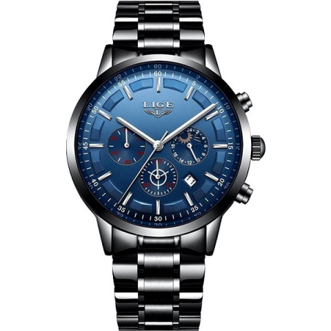 Karóra férfiaknak - analóg idő megjelenítés, óramű típusa quartz, kerek számlap, dátum, fényvisszaverő elemek és stopper, elegáns, arab indexek, 30 m (3 ATM) vízhatlanság, a tok anyaga rozsdamentes acél, a tok színe fekete, a szíj anyaga rozsdamentes acél, a szíj színe fekete A kitűnő LIGE MAN 9877B férfiaknak karóra remek választás a mindennapkora. Az alapját egy 44 mm átmérőjű kerek számlap képezi. A Quartz technológia precíz mérést és hosszú élettart