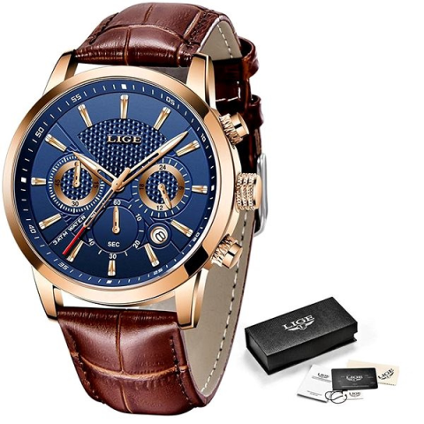 Karóra férfiaknak - analóg idő megjelenítés, óramű típusa quartz, kerek számlap, naptár, elegáns, arab indexek, a tok színe kék és barna, a szíj anyaga bőr, a szíj színe barna, cserélhető szíjjal A kiváló minőségű Lige férfi karóra - barna/kék 9866-9 + ajándék férfiaknak karóra alkalmas mindennapi viseletre. Az alapját egy 42 mm átmérőjű kerek számlap alkotja. A hatékony Quartz technológia pon
