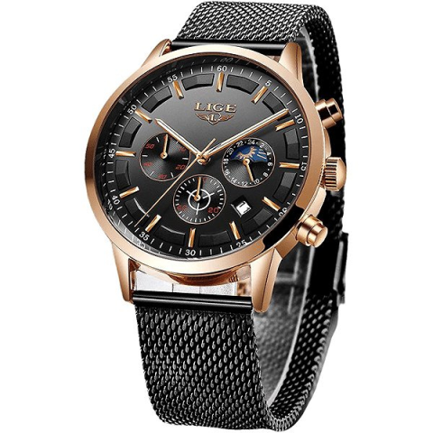 Karóra férfiaknak - analóg idő megjelenítés, óramű típusa quartz, kerek számlap, kronográf, elegáns, arab indexek, ásványi számlap, 30 m (3 ATM) vízhatlanság, a szíj anyaga acél, a szíj színe fekete, 25 cm max. csuklóméretre A nagyszerű LIGE Skyfall fekete férfiaknak karóra jó szolgálatot tesz a mindennapokban. Az évek óta bevált Quartz technológia hosszú élettartamot és precíz időmérést garantál. A klassz acél szíj első