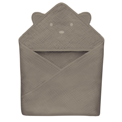 100% pamut muszlin Puha, könnyű és finom Biztonságos a gyermekek bőrére Nem okoz irritációt Tökéletesen elvezeti a vizet A légáteresztő anyag hőérzetet biztosít a gyermek számára Kapucni hímzett állattal Univerzális méret Nem igényel vasa