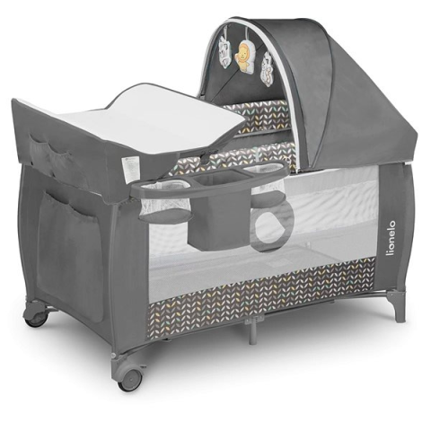 Utazóágy - gyerekeknek, pelenkázó pulttal, pozicionálható, közepes keménységű matraccal, 15 kg terhelhetőség, kerekekkel ellátva, szögletes forma, tárolóhellyel, hordtáskával, körforgóval, szúnyoghálóval, összecsukódásgátló rendszer, összecsukható, fém szerkezet, a huzat anyaga poliészter, nejlon és textil, méretei 77 × 60 × 120 cm (ma × szé × h), méretei (összecsomagolva) 24 × 27 × 78 cm (ma × szé × h), szürke kivitel A keresett Lionelo hordozható