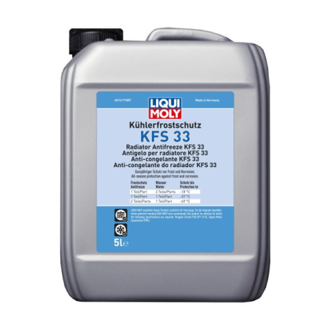 Liqui Moly KFS33 Fagyálló koncentrátum (-70°C) Etilénglikol alapú hatóanyagok kombinációja. Leleményes OAT-gátló csomaggal. Kiváló védelmet nyújt a fagy, a korrózió és a túlmelegedés ellen, és nem tartalmaz aminokat, nitriteket, foszfátokat, borátokat