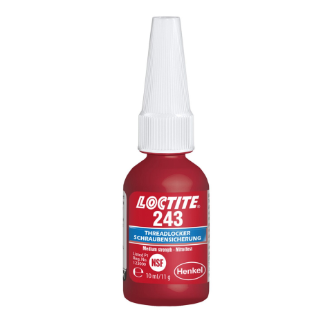 A Loctite 243 közepes erősségű, kék csavarrögzítő ragasztó, amely az anyákat és csavarokat tömíti és rögzíti, hogy meggátolja az ütések és rezgések miatti kilazulásukat.