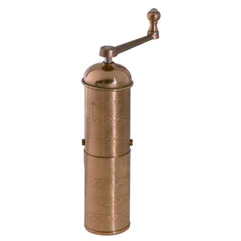Kávédaráló - kézi, őrlőköves, kávétartály kapacitása 25 g, kávédaráló anyaga fém Praktikus fém kávédaráló. Mérete 22 cm. A váz sárgarézből készült. Alkalmas akár még kirándulásokra is. A tartály kivehető. A darálási finomság beállítása egyszerűen történik a felső részen talál