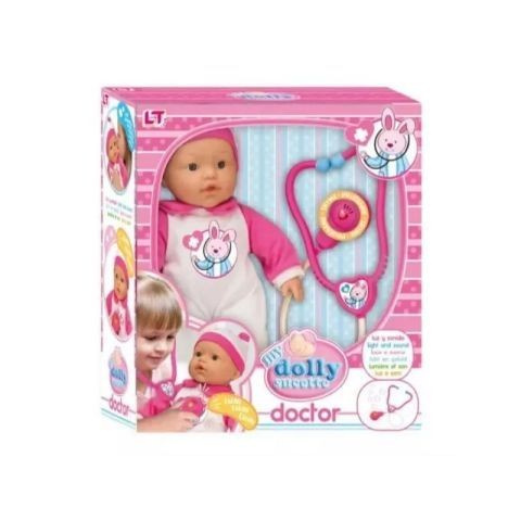 - Játékbaba rózsaszín-fehér ruhában és sapkában - Puha testű - Világító és hangot adó sztetoszkóppal - Baba mérete: 37 cm