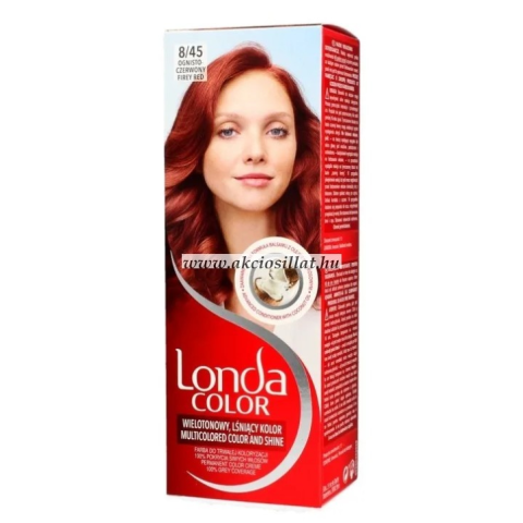 Londa Color hajfesték 8/45 (47) tűzvörös A doboz tartalma: 1 tubus krémhajfesték 50ml 1 db színelőhívó folyadék 50ml 1 intenzív hajfénykiemelő pakolás 10ml 1 használati utasítás 1 pár kesztyű