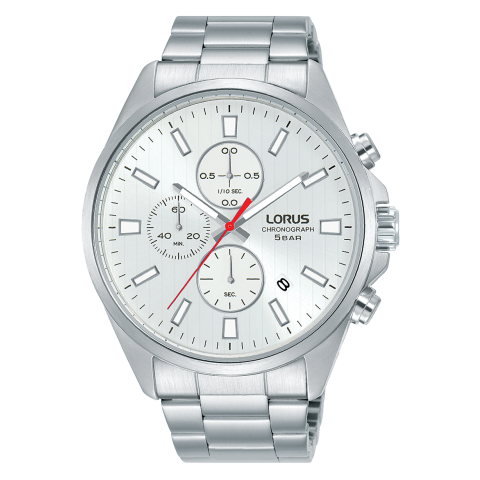 Gyártó: LORUS, Kollekció: Sports, Típus: Férfi, Szín: Világos, Anyag: Nemesacél óraszíj, Vízállóság: 5 bar, Óraszerkezet: Kvarc, Kijelző típusa: Chronograph, Óratok alakja: Kerek, Óratok mérete: 43 mm