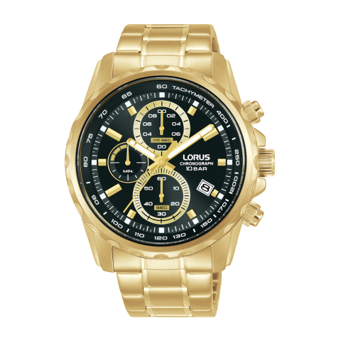 Gyártó: LORUS, Kollekció: Sports, Típus: Férfi, Szín: Sötét, Anyag: Nemesacél óraszíj sárga arany bevonattal, Vízállóság: 10 bar, Óraszerkezet: Kvarc, Kijelző típusa: Chronograph, Óratok alakja: Kerek, Óratok mérete: 43 mm