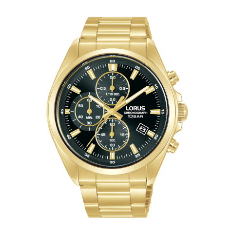 Gyártó: LORUS, Kollekció: Sports, Típus: Férfi, Szín: Sötét, Anyag: Nemesacél óraszíj sárga arany bevonattal, Vízállóság: 10 bar, Óraszerkezet: Kvarc, Kijelző típusa: Chronograph, Óratok alakja: Kerek, Óratok mérete: 42,5 mm