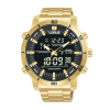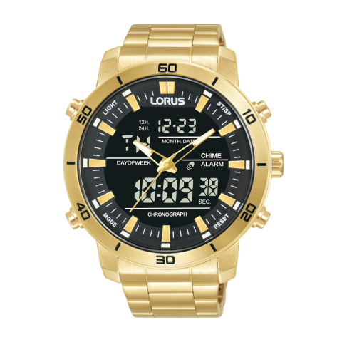 Gyártó: LORUS, Kollekció: Sports, Típus: Férfi, Szín: Sötét, Anyag: Nemesacél óraszíj sárga arany bevonattal, Vízállóság: 10 bar, Kijelző típusa: Ana-Digi, Óratok alakja: Kerek, Óratok mérete: 46 mm