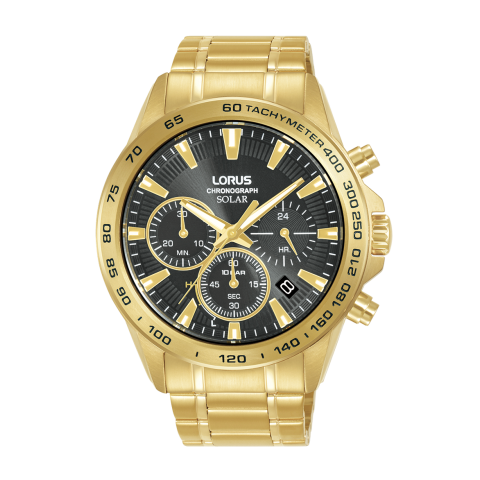 Gyártó: LORUS, Kollekció: Sports, Típus: Férfi, Szín: Sötét, Anyag: Nemesacél óraszíj sárga arany bevonattal, Vízállóság: 10 bar, Óraszerkezet: Solar, Kijelző típusa: Solar Chronograph, Óratok alakja: Kerek, Óratok mérete: 43,8 mm