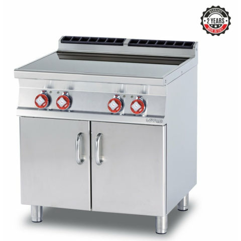 2 körös üvegkerámia főzőlappal, hőfokszabályzóval, alul nyitott tárolóval, termoszstatikus hőmérséklet szabályozóval - 150-300°C. Teljesítmény: 5 (2x2,5) kW/400V-3N~ Mérete: 400x705x900 mm