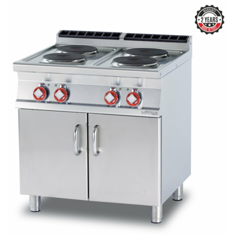 4 db 22 cm-es kerek öntvény főzőlappal, 7 pozíciós hőfokszabályzóval, alul nyitott tároló, állítható lábakon. Teljesítmény: 10,4 (4x2,6) kW/400V-3N~ Mérete: 800x705x900 mm