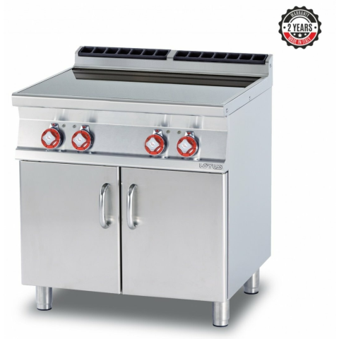 4 körös üvegkerámia főzőlappal, hőfokszabályzóval, alul nyitott tárolóval, termoszstatikus hőmérséklet szabályozóval - 150-300°C. Teljesítmény: 10 (4x2,5) kW/400V-3N~ Mérete: 800x705x900 mm