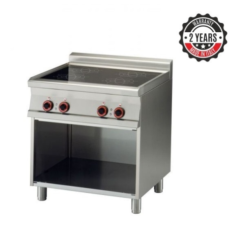 4 db indukciós főzőlap, pozíciós hőfokszabályzóval, alul nyitott tárolóval, termoszstatikus hőmérséklet szabályozóval - 150-300°C. Teljesítmény: 20 (4x5) kW/400V-3N~ Mérete: 800x705x900 mm