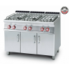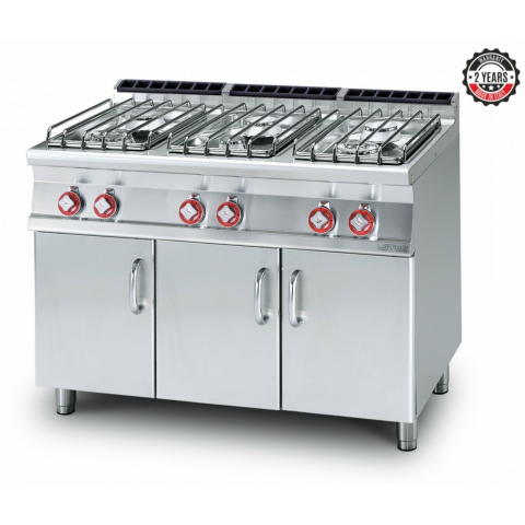 6 db nagy hőteljesítményű égőfej, rozsdamentes égőtálcák és edénytartó rács, állítható lábakon, alul nyitott tárolóval, termoszstatikus hőmérséklet szabályozóval 150-300°C. Teljesítmény: 35 kW gáz/30.100 kcal/óra (1x3,5kW; 3x5,5kW; 2x7,5 kW gáz) Mérete: 1200x705x900 mm