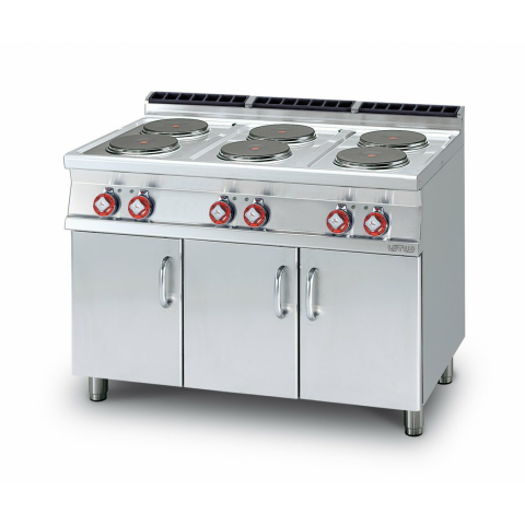 6 db 22 cm-es kerek öntvény főzőlappal, 7 pozíciós hőfokszabályzóval, alul nyitott tároló, állítható lábakon. Teljesítmény: 15 (6x2,6) kW/400V-3N~ Mérete: 1200x700x900 mm