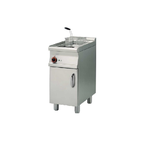 18 literes medence, lekerekített medence sarkok, tisztítható fűtő elemek, fronton elhelyezett hőfokszabályzó, 1 db 280x290x150 mm-es műanyag nyelű rozsdamentes fritőzkosár, kosár akasztó, olajszűrő, alsó olaj leeresztő csap és olajgyűjtő edény ajtós tárolóban, állítható lábakon. Kapacitás: 15 kg/óra (burgonya) Teljesítmény: 15,9 kW/400V-3N~ Mérete: 400x705x900 mm