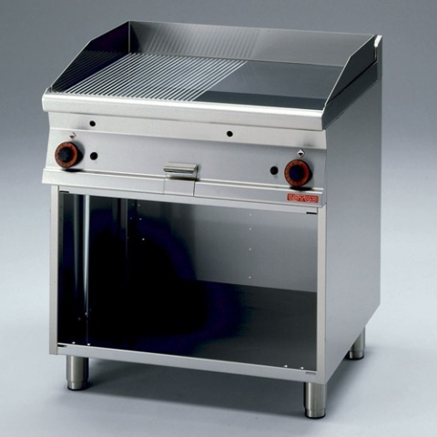 Sima/bordás sütőfelület, termoszstatikus hőfokszabályzó, zsírfogó edény, 3 oldalon fröccsenés gátló, alul nyitott tároló, állítható lábakon. Teljesítmény: 9 (2x4,5) kW/400V-3N~ Mérete: 800x700x900 mm