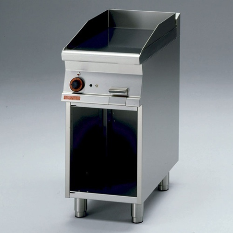 Sima sütőfelület, termoszstatikus hőfokszabályzó, zsírfogó edény, 3 oldalon fröccsenés gátló, alul nyitott tároló, állítható lábakon. Teljesítmény: 5,55 kW/400V-3N~ Mérete: 400x705x900 mm