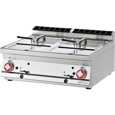Rozsdamentes acél fedővel és rozsdamentes acél kosártartó ráccsal. Kapacitás: 2x13 literes űrtartalmú medence Teljesítmény: 24 kW Kosár méret: 280x290x100 mm Külső méret: 800x700x280 mm Súly: 81 kg