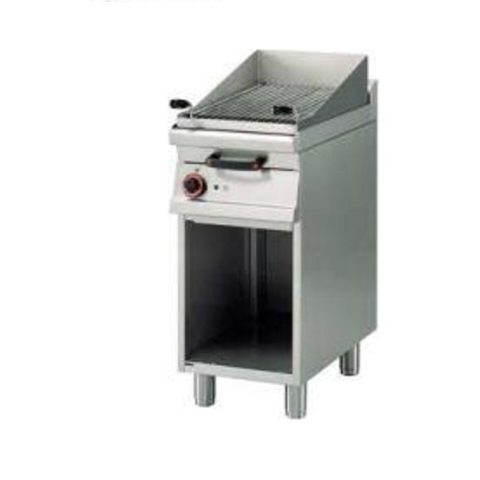 Bordás sütőfelület, piezó-elektromos gyújtás, zsírfogó edény, 3 oldalon fröccsenés gátló, alul nyitott tároló, állítható lábakon. Teljesítmény: 7 kW gáz/6.020 kcal/óra (1x7kW gáz) Mérete: 400x705x900 mm