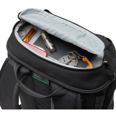 Fotós hátizsák - 30 l űrtartalommal, félmerev szerkezet, moduláris belső elrendezés, kétkamrás, notebook tárolására alkalmas rekesz, oldalsó és felső hozzáférés, memóriakártya tartó, akku tároló és értéktároló zseb, állítható, párnázott pántok vállra, mellkasi és derék szíj, tartozékrögzítő pánt, felső hordfül, vízálló anyag, párnázott válaszfalak, ergonomikusan kialakított hátlap, szellőző hátlap és beépített esővédő huzat, fekete k