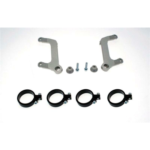 A tartó szilárd alumíniumból marásolt. A rögzítő bilincsek elérhetők különböző villa átmérőkkel a leggyakoribb mezítlábas motorokhoz. Szükség esetén a villa szélességét illesztőszemekkel lehet kiegyensúlyozni. A villa lábszáron lévő bilincsek közötti távolság 115 mm. A tervezés során vegye figyelembe, hogy a fényszóró optikai okokból nagyon közel van a villához. A járműtől függően ez konfliktushoz vezethet az eredeti műszerek/tartók és a gyújt