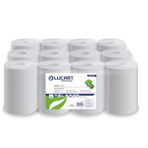 Kéztörlő, tekercses, 2 rétegű, LUCART, Eco CF 14, fehér Jó nedvszívó, finom anyagú hengeres kéztörlő. 2 rétegű, fehér színű. Perforált lapszéllel. Lapméret: 19x23 cm Átmérő: 14 cm Lapszám: 240 Kiszerelés: 12 db/ csomag „A korábbi BokkPaper új már