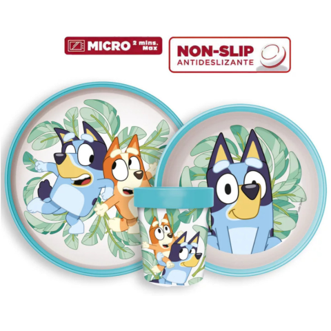 RAKTÁRRÓL AZONNAL! Bluey csúszásmentes étkészlet, micro műanyag szett - BPA mentes - A termék környezetbarát, újrahasznosítható anyagból készült a Föld védelmében - Csúszásgátló talp rész A készlet tartalma: 1 db mélytálka (mikrózható műanyag) 1 db lapos