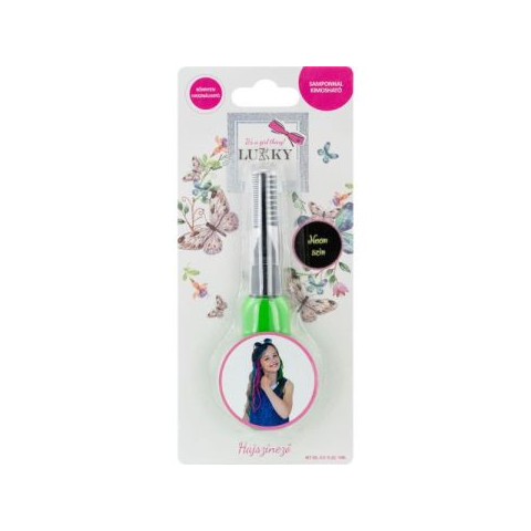 Tündöklő színes hajak a Lukky hajszínezőkkel! Használata biztonságos, így a gyerekek is bátran kipróbálhatják. A hajsmink vízbázisú, samponnal könnyen lemosható. Legyen gyerekzsúr, születésnap, farsang vagy szilveszter, a Lukky hajszínező tökéletes választás lesz! Színe: Neon zöld Csomagolás mérete: 12 x 9 x 2 cm Tartalom: 1 db hajszínező spirál.