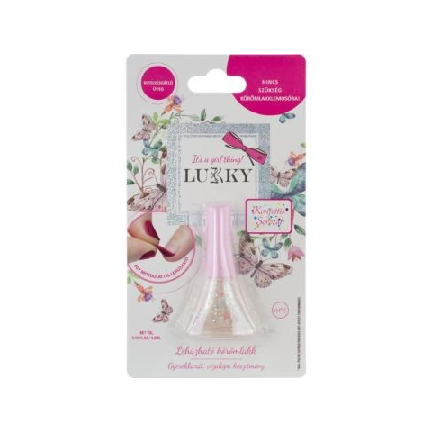 Korosztály: 3 és 14 év közöttHányan játszhatják: 1 játékos Lehúzható körömlakk a Lukky-tól! Használata egyszerű, hiszen nincs szükség körömlakk lemosóra, egy pillanat alatt lehúzható. Gyermekek számára biztonságos, vízbázisú anyagból készült. A kicsik önállóan is használhatják a körömlakkot, ha felborulna az üveg, nem folyik ki a lakk. Színe: átlátszó, színes konfettikkel.