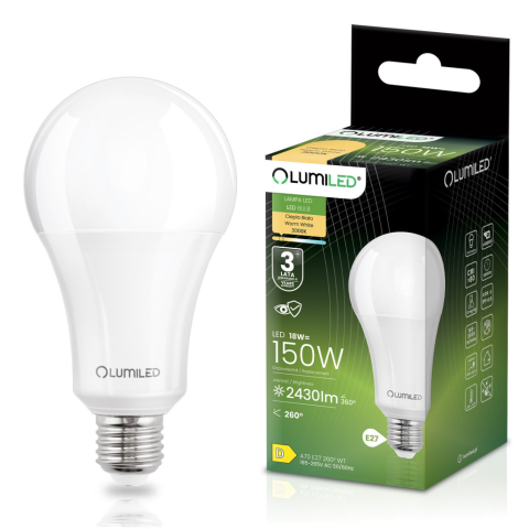 1 kép LUMILED LED izzó E27 A70 18W = 150W 2430lm 3000K Meleg 260° LUMILED