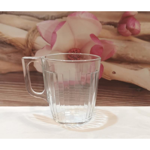 Áttetsző üvegpohár füllel, belül dombornyomott csíkdíszítéssel.
