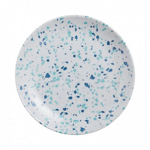 A Diwali 19 cm-es desszert tányérokkal megegyező méretű és formájú, szürke alapon, színes ( kékes-zöldes) gránit mintázattal.