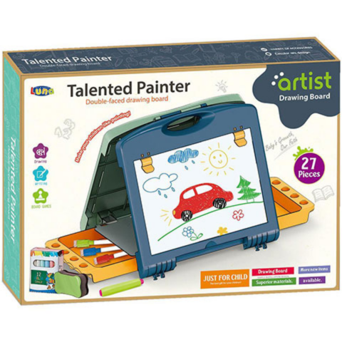 A kreatív gyerekek számára remek választás ez a kétoldalú rajztábla, amivel szabadon alkothatnak, és pillanatok alatt alakíthatnak ki bárhol egy rajzstúdiót. A készlet egy fogantyúval ellátott műanyag táskában kapott helyet, amit azonban egyetlen mozdulattal szét lehet kinyitni, és akár álló állapotban is lehet rögzíteni. A doboz belsejében olyan hasznos apróságok kerül